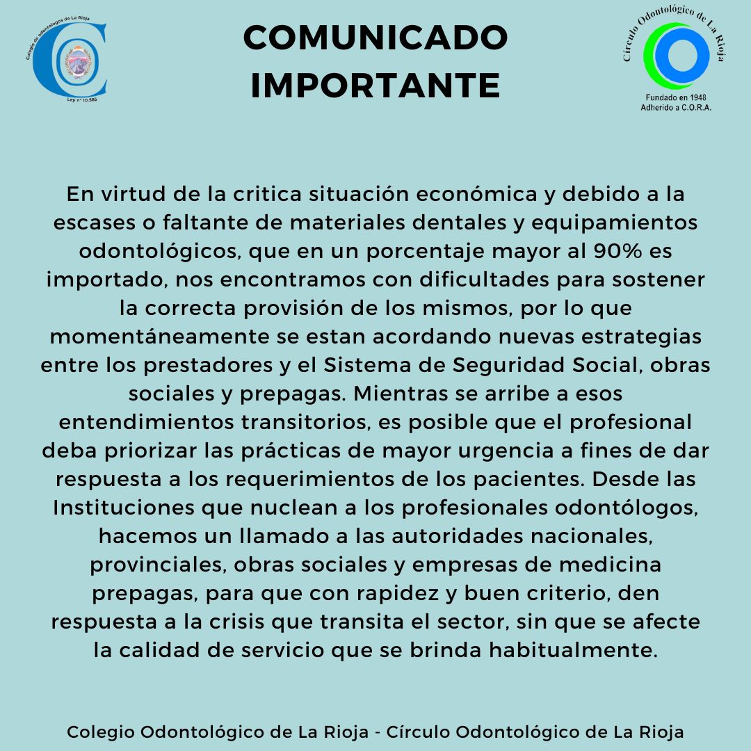 En virtud de la critica situación económica y debido a la escases o faltante de materiales dentales y equipamientos odontológicos, que en un porcentaje mayor al 90% es importado, nos encontramos con dificultades para sostener la correcta provisión de los mismos, por lo que momentáneamente se estan acordando nuevas estrategias entre los prestadores y el Sistema de Seguridad Social, obras sociales y prepagas. Mientras se arribe a esos entendimientos transitorios, es posible que el profesional deba priorizar las prácticas de mayor urgencia a fines de dar respuesta a los requerimientos de los pacientes. Desde las Instituciones que nuclean a los profesionales odontólogos, hacemos un llamado a las autoridades nacionales, provinciales, obras sociales y empresas de medicina prepagas, para que con rapidez y buen criterio, den respuesta a la crisis que transita el sector, sin que se afecte la calidad de servicio que se brinda habitualmente.