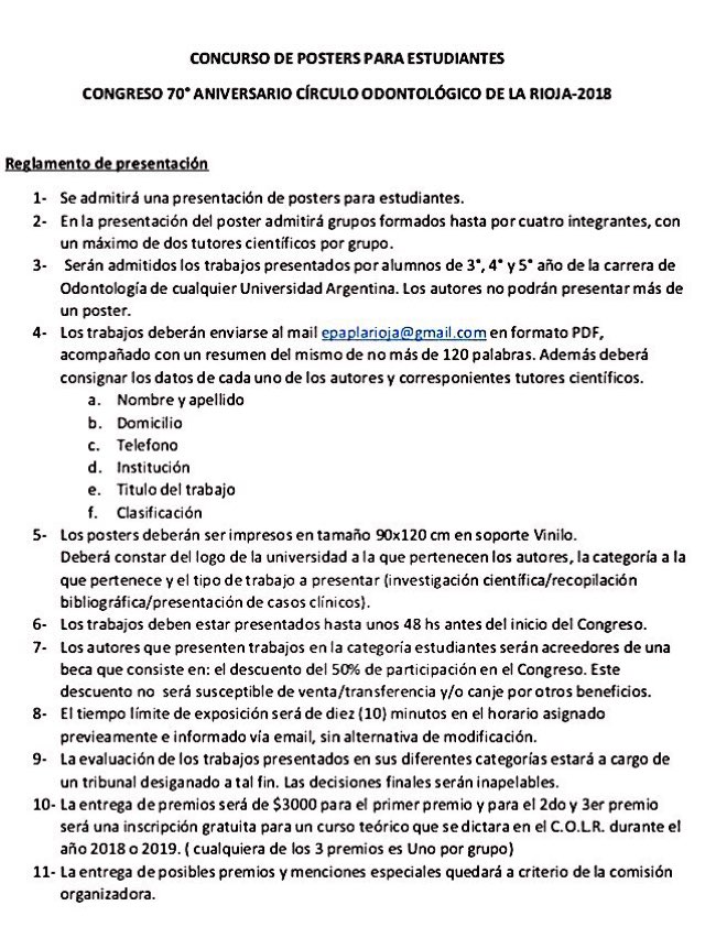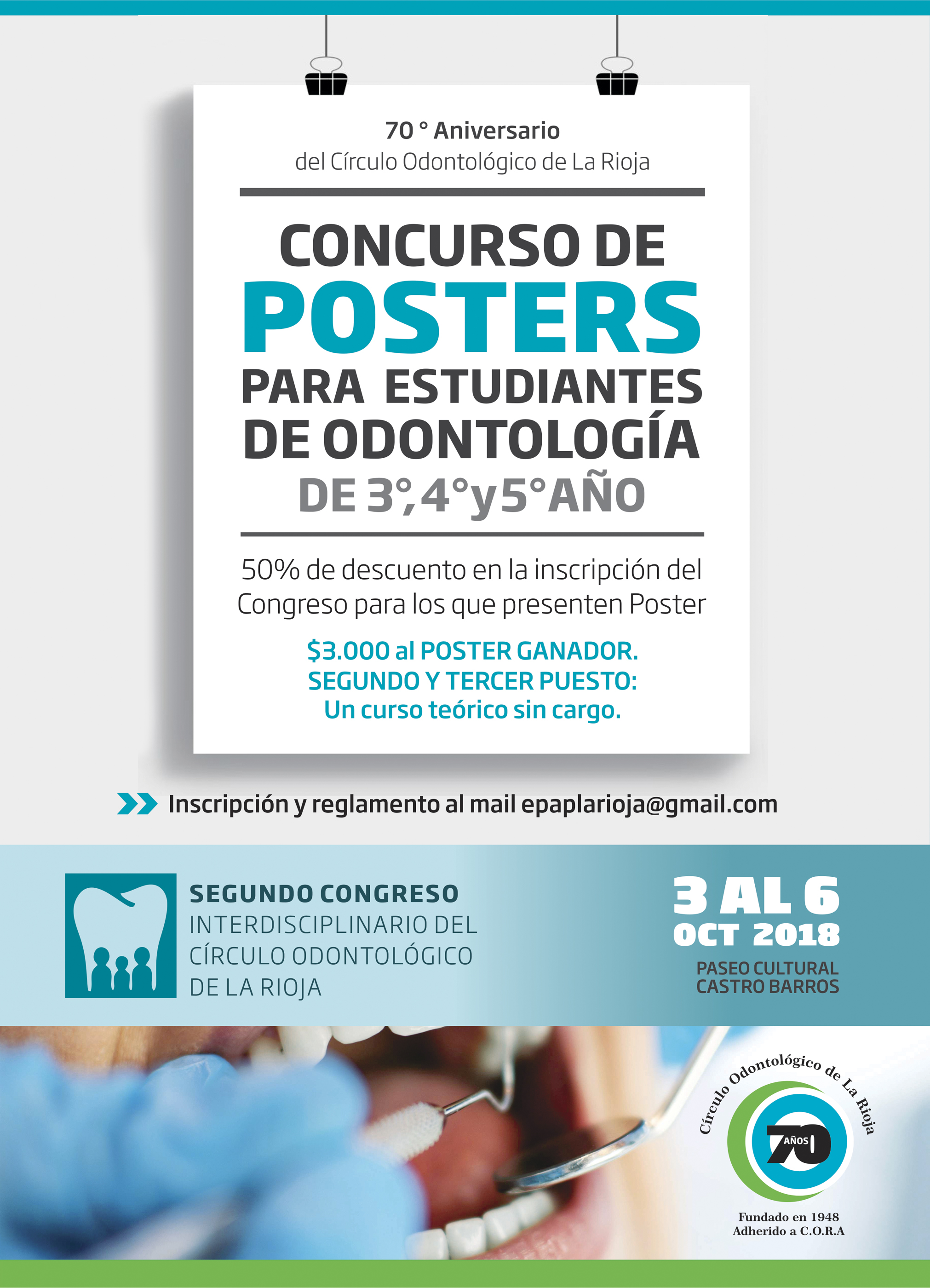 La comisión organizadora del 2° Congreso Interdisciplinario del COLR convoca a los estudiantes de Odontología a participar en el Concurso de Posters, con las 2 categorías: Búsqueda Bibliográfica y Casos Clínicos. Habra el 50% de descuento en el arancel del Congreso a los que participan, como también interesantes premios para los ganadores del 1er, 2do y 3er puesto. ( ver bases y pautas)