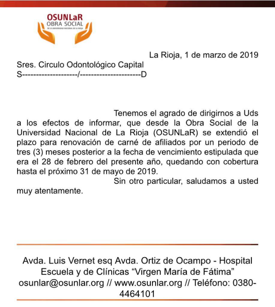 Desde la Obra Social OSUNLaR se informa a los prestadores que se modificó el plazo de renovación de los carné de afiliado con un plazo de tres meses posterior a lo que figura en la credencial. La fecha antes estipulada (28 de febrero de 2019) fue modificada y se extendió hasta el día 31 de mayo del corriente año.