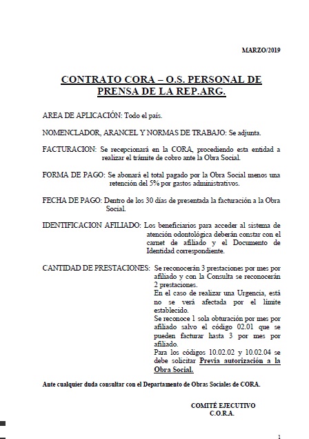 A través de una circular infromativa la Confederación Odontológica de la República Argentina, informó nuevos aranceles para ambas obras sociales (los cuales estarán vigentes a partir del 01/03/2019), como así también nuevas normas de trabajo para la obra social del personal de prensa de la República Argentina (OSPPRA).