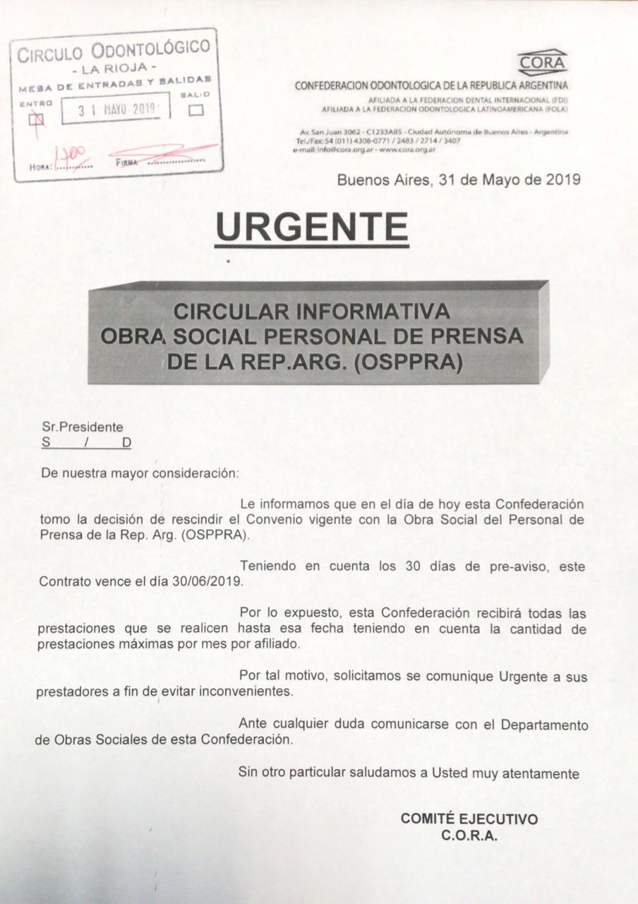 A través de una circular informativa, la Confederación Odontológica de la República Argentina anuncia que rescindió contrato con la OBRA SOCIAL DEL PERSONAL DE PRENSA DE LA REPÚBLICA ARGENTINA. Se recibirá la facturación que se realice con esta obra social hasta el día 30/06/2019, fecha en la cual finaliza el contrato con la misma.