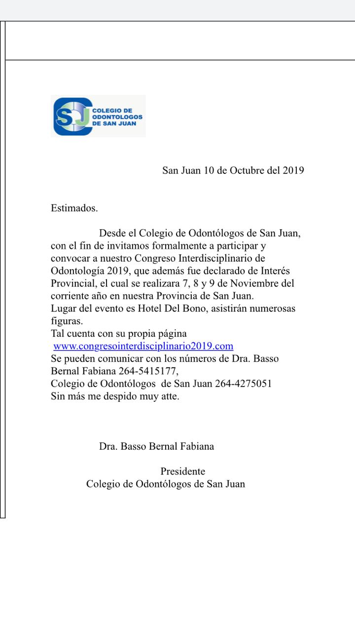 Los días 7, 8 y 9 de Noviembre se desarrollará en la provincia de San Juan el CONGRESO INTERDISCIPLINARIO DE ODONTOLOGÍA organizado por Círculo Odontológico de San Juan. Es por ello, que dicha Institución hace llegar su invitación a todos los profesionales que deseen asistir a estas jornadas, las cuales contarán con la presencia de colegas de Argentina, Chile y Uruguay.