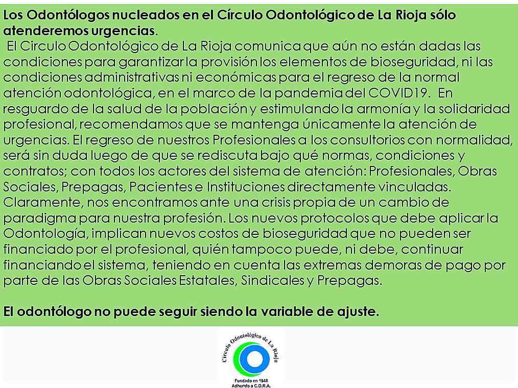 El Circulo Odontológico de La Rioja comunica que aún no están dadas las condiciones para garantizar la provisión de los elementos de bioseguridad, ni las condiciones administrativas ni económicas para el regreso de la normal atención odontológica, en el marco de la pandemia del COVID19.