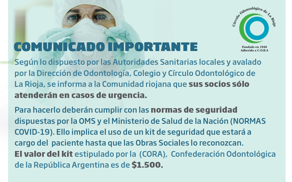 Mientras dure la negociacion con la totalidad del padron de Obras Sociales, (hasta ahora la mejor propuesta es de $1700), sugerimos adoptar los aranceles del Colegio de Odontologos de la Provincia de La Rioja recientemente modificado, con fecha del 20 de Abril y ademas trasladar al paciente el costo del kit de seguridad descartable, camisolin o traje hidrorepelente, Cofia, cubre calzado, protectores oculares, barbijo N95, pantalla protectora, campo protector para el paciente, etc. Sabemos de la falta de stock es a nivel Nacional y que se iencuentra agotado en las casas de suministro de nuestro medio. *APELAMOS A LA RESPONSABILIDAD Y ETICA PROFESIONAL DE NO REALIZAR NINGUN TIPO DE ATENCION, SI NO SE POSEE EL MISMO, HASTA NO ADQUIRIR STOK. Evitemos la posibilidad de contagio o de convertirnos en vectores de la enfermedad en la comunidad. Cuidemos nuesta salud, la del paciente y la de ambas familias. Por favor, no nos dejemos llevar por la desesperacion o la angustiante situacion economica. Atendamos solo las URGENCIAS hasta que las autoridades sanitarias indiquen lo contrario. Los mantendremos indormados, en la medida que avance la negociacion con las diferentes Obras Sociales. Muchas gracias
